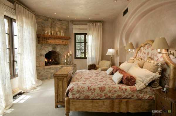 Камин в спальне, выполненный в стилистике кантри встречается не так часто. Но всегда производит сильное впечатление. Каменная кладка в кампании с деревянной рустикальной каминной полкой создают деревенский характер обстановки, который может стать идеальным вариантом для комнаты в загородном доме.