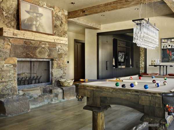 Еще один пример рустикального камина на этот раз расположенного в гостиной, совмещенной с игровой зоной. Ни что так не придает брутальности и некоторой первобытности помещению, как грубовата каменная кладка и деревянные балки в интерьере.