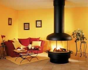 центральные камины могут быть двух типов: напольные и подвесные. В первом случае, камин находится на полу, в центре помещения, а дымоходная труба крепится к потолку. Во – втором, камин соединен с подвешенным дымоходом и становится практически трансцендентным объектом, свежим и, на удивление, оригинальным. Корпус центрального камина может быть пирамидальным, шарообразным, кубическим и, как правило, закрытым одним или несколькими стеклокерамическими окнами, позволяющими видеть языки пламени с любой стороны. Исключение составляют островные камины с открытой топочной зоной, например, от известной французской компании FOCUS, которая предлагает отдельные каминные серии без термостекла, имеющие сравнительно небольшую тепловую эффективность (59%): GIROFOCUS, DOMOFOCUS или BATHYSCAFOCUS.