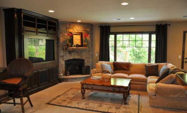 - Угловой вид камина является самым удобным и практичным, его помещают в углу комнаты. При этом он не занимает много места, рядом удобно расположить предметы мебели, а также является красивым дополнением в интерьере гостиной.