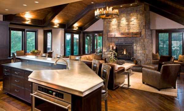 Хотите стилизировать комнату под охотничий домик? Нет проблем! Обшейте стены древесной вагонкой, прикрепите к потолкам грубые балки из того же материала и установите массивный камин из нетесаного камня в интерьере квартиры. Поверьте, эффект будет потрясающий. Заходя в такую комнату, вы словно будете переноситься в другой мир.