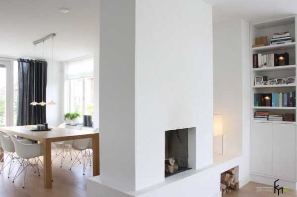 Как правило, каминное пространство имеет выступ по отношению к стене, но в этой минималистской гостиной очаг расположен в нише, которую при желании можно закрыть нишей-купе. Выступ перед камином можно использовать как место для сидения или открытую полку, а небольшую нишу – в качестве поленницы.