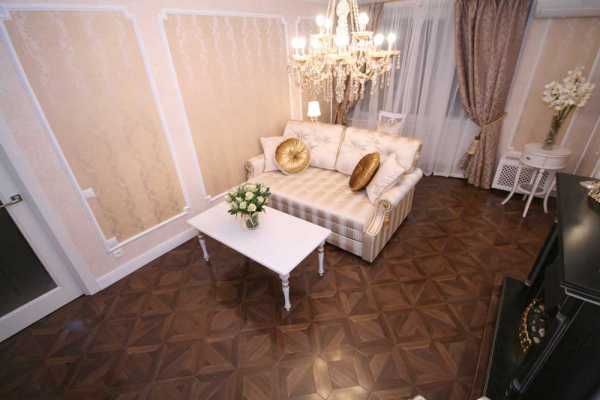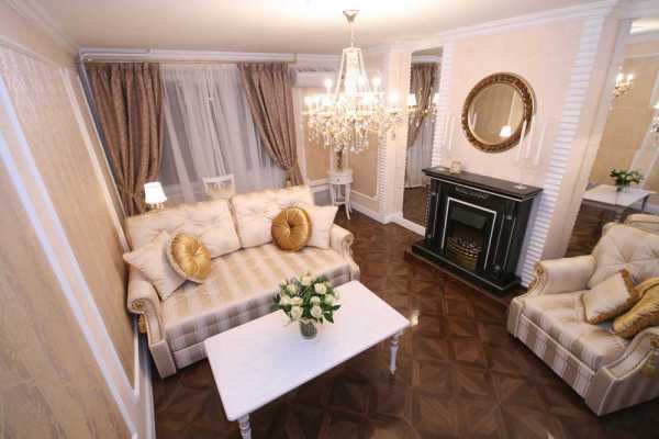 Основные цвета интерьера — бежевый, белый и коричневый. Стены оклеяны флизелиновыми обоями. В обрамлении пенополиуретановой лепнины на фоне шёлковой штукатурки они кажутся вытканными из дорогого шёлка ручной работы. Ниши возле камина, облицованные зеркальной плиткой, создают пространственную интригу. Они не только эффектно выделяют его, но и делают комнату более объёмной.