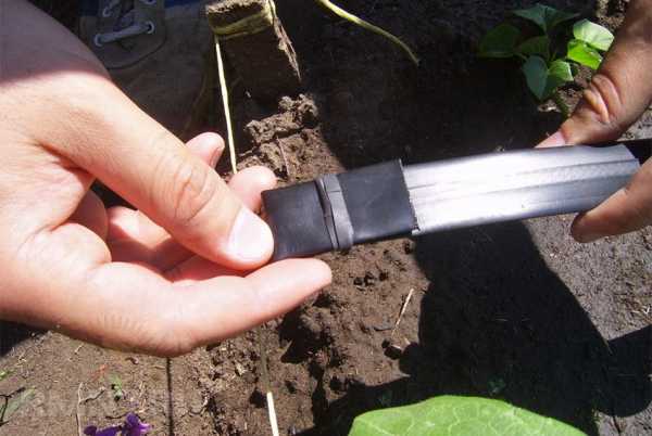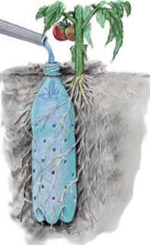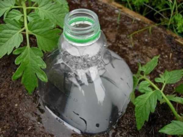 - Возле растения, которому предназначена тара, необходимо сделать лунку соответствующего диаметра и такой глубины, чтобы над землей выступала лишь узкая часть бутылки.