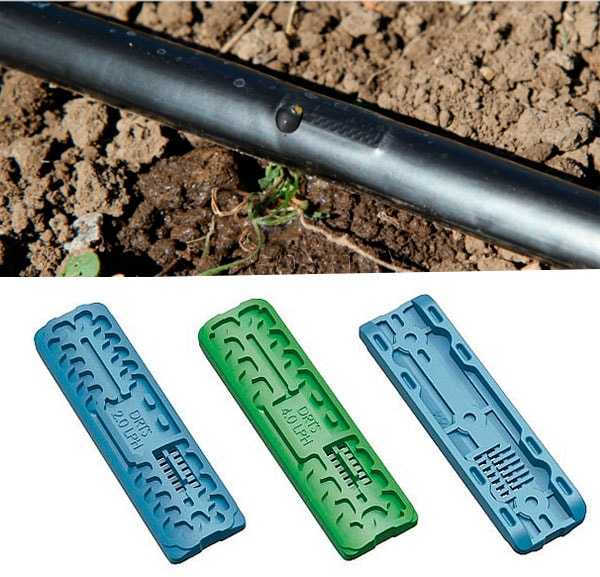 Эмиттерная лента изготавливается со встроенными капельницами, в них формируются водные завихрения, вымывающие мусор. Сами капельницы могут быть компенсированными (в любом месте ленты пропускает одинаковое количество воды) и некомпенсированными (чем дальше от источника воды, тем слабее капает полив).
