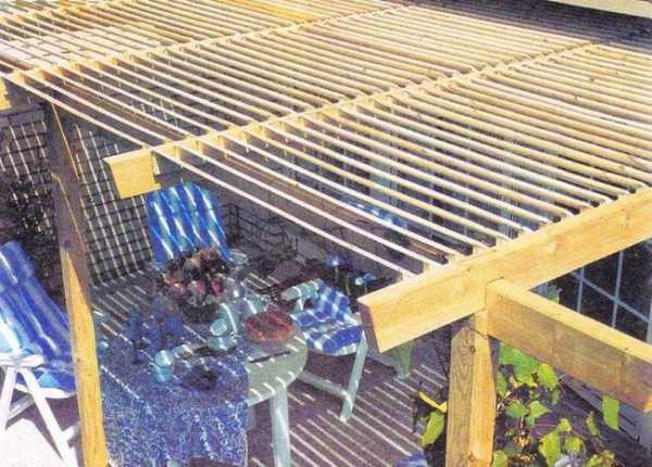 Перпендикулярно дому укладываем стропила из доски 150*40 мм, на балку крепим уголками, на обвязку – салазками, навис ноги с внешнего края +300 мм, чтобы осадки не попадали внутрь. Поперек, через каждые 500-900 мм стелим обрешетку из тонкого бруска 20-40 мм. Каркас обрабатываем антисептиком и противопожарным раствором, лакируем или красим цветным лаком. Парапет можно выполнить из любого материала или оставить открытым, оформив его клумбами, декоративными кустами, вьюнами.