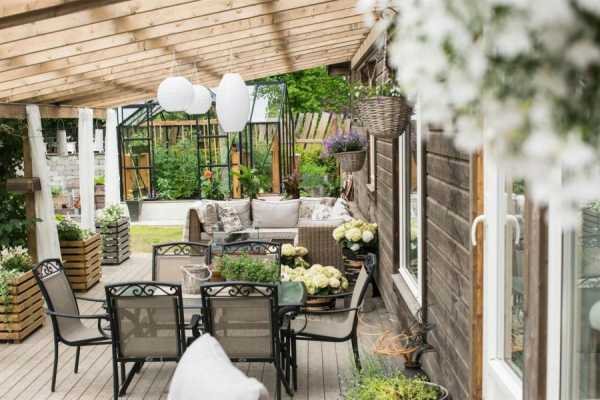 Некоторые оставляют крышу открытой и высаживают возле площадки вьюны, которые разрастаются и создают природный тент. Фото открытых навесов из дерева к дому наглядно демонстрируют привлекательность конструкции.