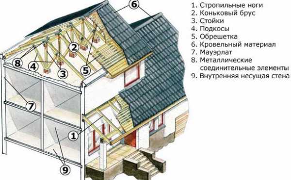 - Система стоек – вертикальные опорные конструкции, поддерживающие систему стропил;