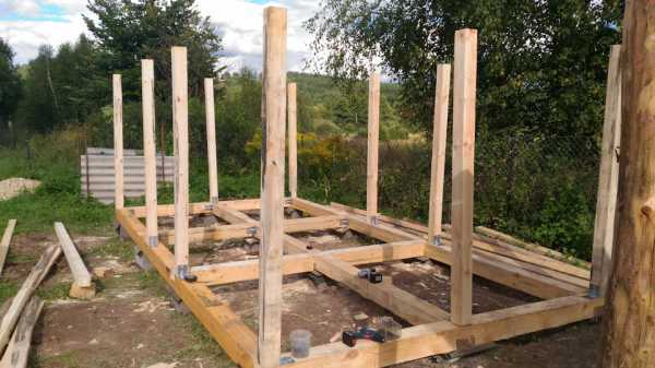Основа каркасного дома — рамы, собранные из деревянного бруса. В зависимости от планируемых размеров бани для их сборки используют брус 100*150 или 150*150 мм. Для укосин, и поперечин, которые прибиваются между вертикальными стойками, подойдут бруски меньшей толщины.