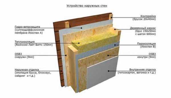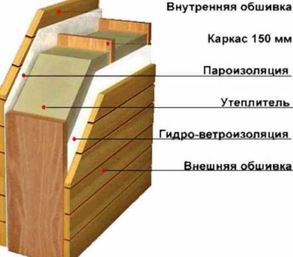 В результате проделанной работы должно получиться некое подобие пирога для стен бани из следующих слоев: