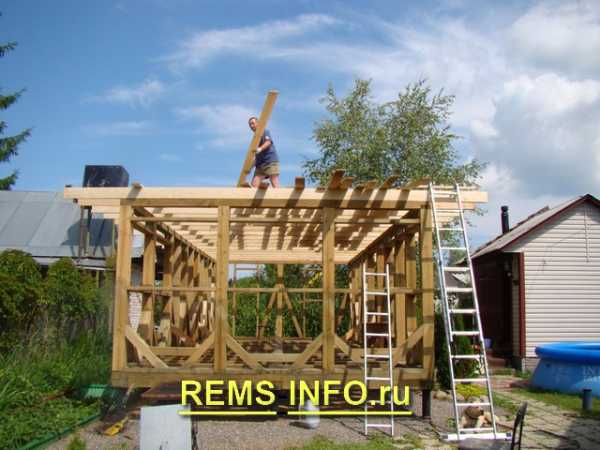 Делаем крышу- Монтируем потолочные балки и собираем стропильную систему для нашей будущей крыши. Делаем обрешетку под тот вид материала для настила, который заложен в нашем проекте.
