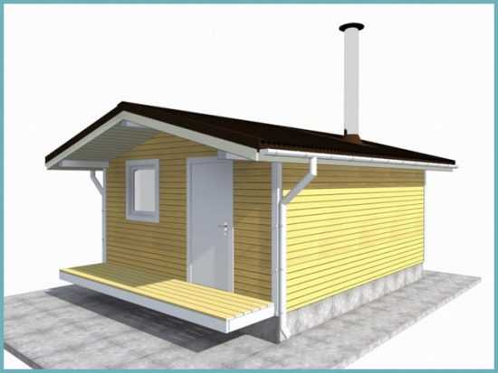 Вариант для небольших земельных участков. Он рассчитан всего на несколько человек и подойдет для небольшой семьи. Такая баня будет иметь низкую стоимость, собрать ее будет просто. В ней обычно отсутствует отдельная комната отдыха, она либо заменена на веранду, либо объединена с тамбуром.