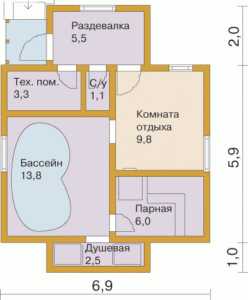 Вы также можете найти и скачать проект каркасной бани с бассейном. Особенно актуальны такие чертежи для тех, у кого рядом с участком нет озера или речки.