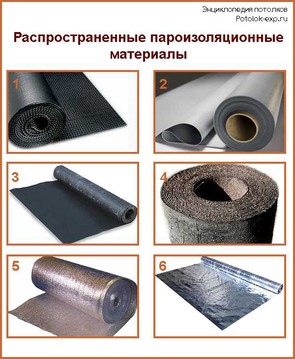 Распространенные пароизоляционные материалы: 1. Геосинтетика. 2. ПВХ-мембрана. 3. Пергамин. 4. Толь. 5. Алюминиевая фольга. 6. Термофол.