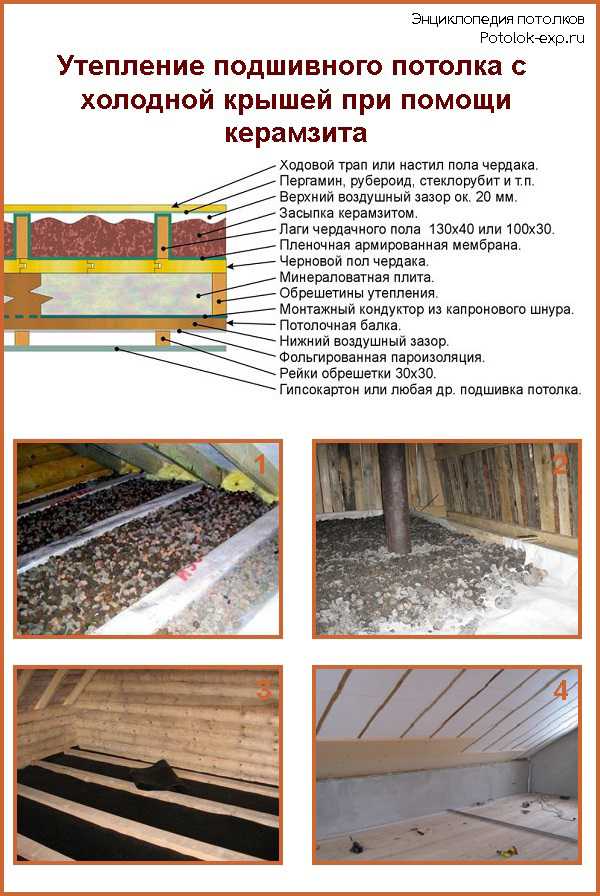 Немного иначе выглядит процесс утепления подшивного потолка бани с холодной крышей в случае, когда используется керамзит или цементно-опилочная смесь. Представим это в виде пошаговой инструкции.