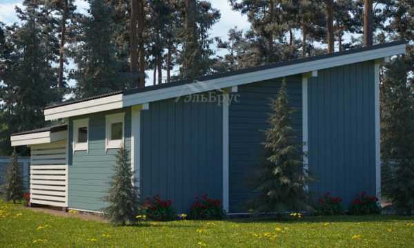 Лаконичное строение с плоской крышей. Один из экономичных и простых в сооружении вариантов. Устраивается на основе мелкозаглублённого ленточного фундамента. Кровля имеет односкатную конструкцию с оптимальным углом уклона. В схему включено окно и дверь для выхода на улицу.