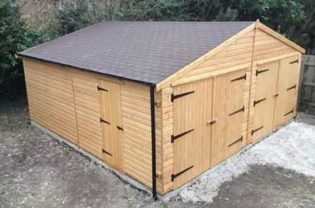 Двуместный гараж больших размеров, с устройством нескольких окон и входных дверей. Конструкция ворот общая. Его выполняют из бруса для обеспечения тепла. Возможна замена на металлопрофиль, но с последующим утеплением и обеспечения отопления.