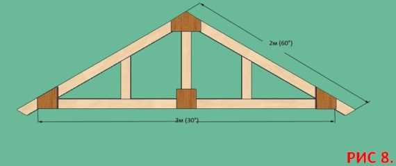 - Для двускатной кровли нам потребуются фермы. Скрутим их из заранее подготовленных досок. Чтобы сделать двускатную ферму необходимо две доски длиной 2 м (с обрезанными концами под углом 600) соединить с трехметровой доской, у которой концы обрезаны под углом 300. Прочность соединения могут обеспечивать саморезы или болты, которые прикручивают с торцов и через вставленные по углам обрезки толстой влагостойкой фанеры, а также обрешетка (рис 8).