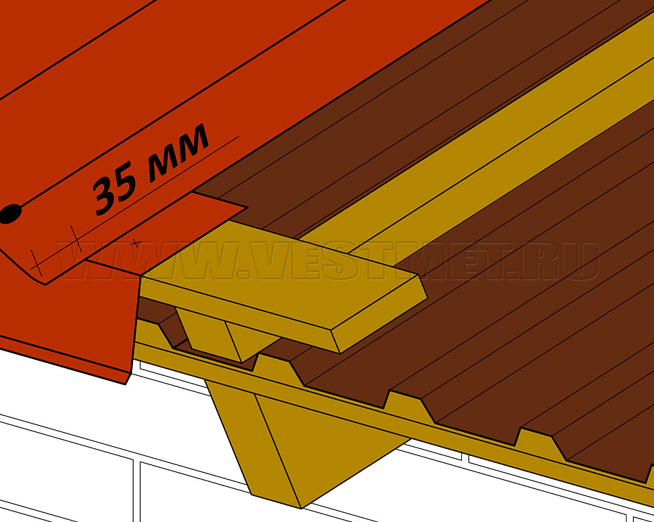 – на торце обрешетки закрепляется ветровая доска. Верхняя грань ветровой доски должна быть выше уровня обрешетки на 35 мм;