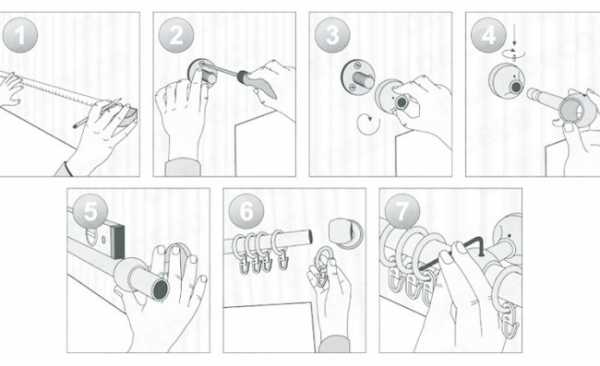 Круглая штанга, кольца с креплениями, наконечники и кронштейны – основные элементы конструкции классического карниза.