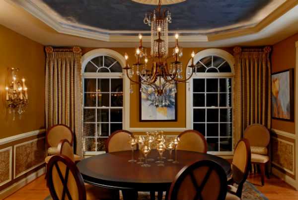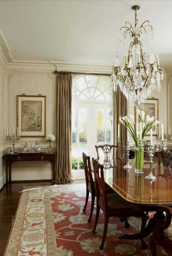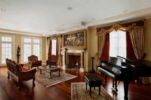 Нельзя также не отметить массивные карнизы, украшенные резьбой по дереву, безусловно, они смотрятся не просто хорошо, а по-настоящему идеально. Особенно когда самые удачные элементы подчеркиваются патиной или позолотой.