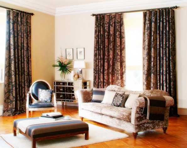 На фото, представленных ниже, можно увидеть, что располагаются шторы на специальных элементах, занимают площадь от пола и до потолочной зоны, могут поставляться с ламбрекенами, а также целым рядом других аксессуаров.