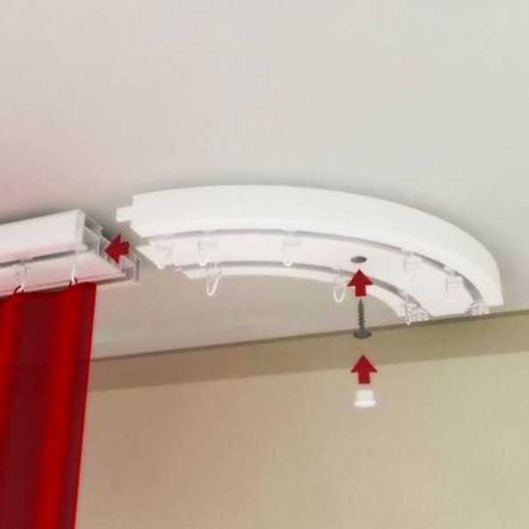 Существуют два основных типа крепления карнизов: к потолку и к стене. Среди некоторых потолочных видов есть и те, что закрепляются к стене при помощи специальных подпорок. Здесь понадобятся дополнительные аксессуары. Самая востребованная длина – три метра. При необходимости получить конструкцию размером больше можно путем составления его из коротких карнизов и соединительных элементов. Держатели и крепления поставляются в комплекте.