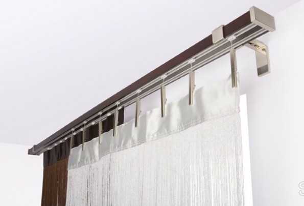 Не менее распространенными считаются профильные системы. Эти конструкции имеют специальные шины, к которым крепятся элементы, передвигающие тканевое полотно. Их часто выполняют из пластика и алюминия, имеют маленький вес и хорошо удерживают любые занавеси.