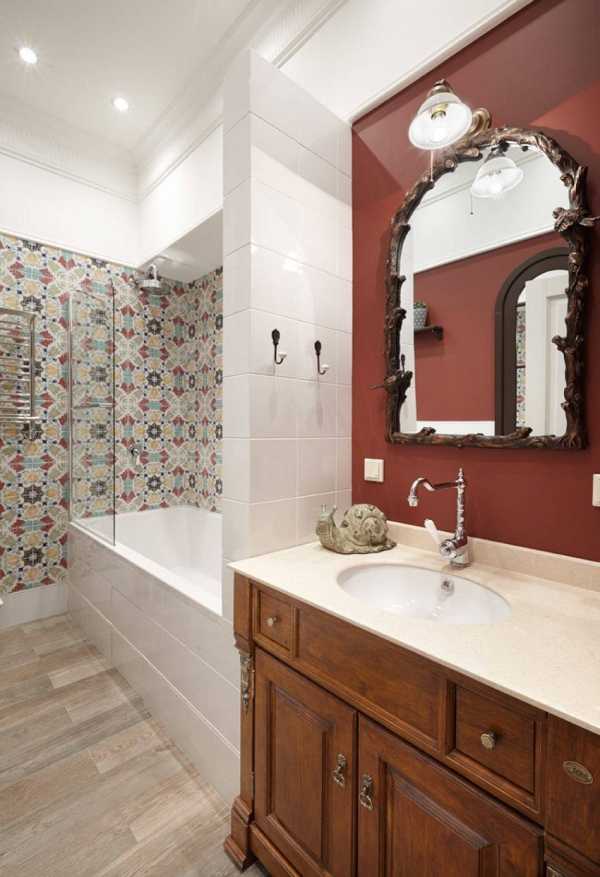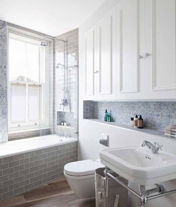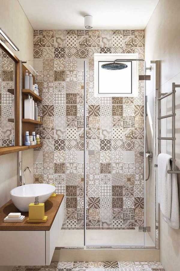 Отличное сочетание плитки разных цветов и размеров в интерьере ванной комнаты