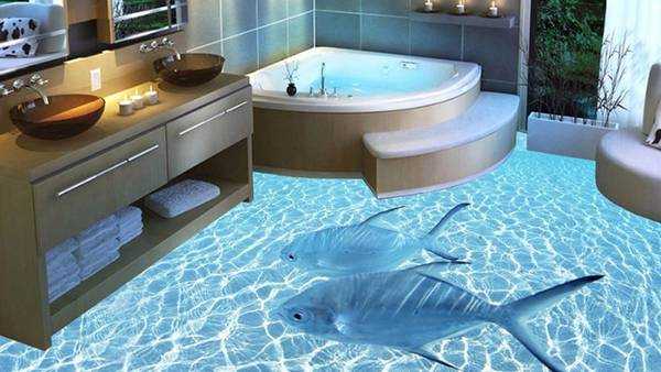 - В ванную комнату чаще выбирают изображения с водопадами или морскими обитателями: декоративные рыбки, черепахи, дельфины. Можно подойти к этому творчески и создать несколько рисунков с перекликающими сюжетами на разных плитках, или выложить один понравившейся пейзаж. Ведь вариантов интерьера очень много, и для каждого можно подобрать интересный рисунок.