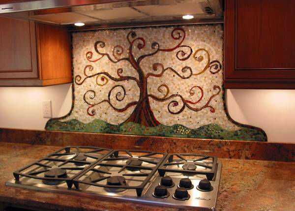 Мозаичное панно из плитки на кухню пользуется популярностью среди всех. При изготовлении такого панно используют разнообразные цветные плитки, которые имеют маленький размер 2−3 сантиметра. Эти плиточки выкладывают таким образом, чтобы образовался узор или картина. Подобная техника применяется при создании изображений, в которых используют битую керамическую плитку для кухни на фартук.