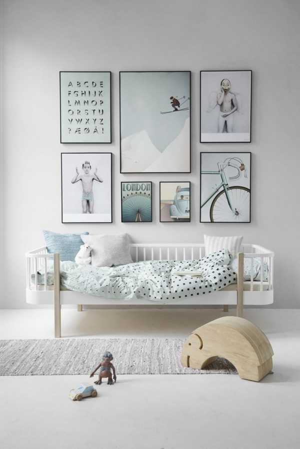Если вы хотите расположить рамки симметрично, то будьте аккуратны, поскольку они будут требовать затем симметрии от всего в интерьере комнаты. Например, такой прием в детской будет как минимум неуместным. Можно расположить экспозицию примерно «по вырастанию», от меньшего к большему, но тогда стоит внести какой-то дополнительный декор на стену, который будет поддерживать эту «мысль» и перекликаться с ней.