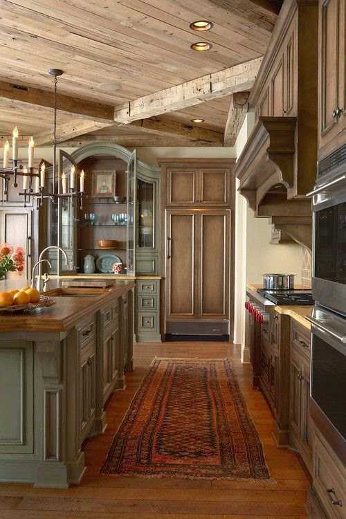 Цвет кухонного острова может отличаться от цвета основной кухни. Свежая интерпретация классического стиля позволяет играть с оттенками и придать “новое звучание” даже старому кухонному гарнитуру. Широкий диапазон современных лакокрасочных покрытий не ограничивает ваши фантазии. Можно выбрать любой оттенок из цветового спектра, использовать технику патины и старения, чтобы в полной мере насладиться красотой кухни из дерева.