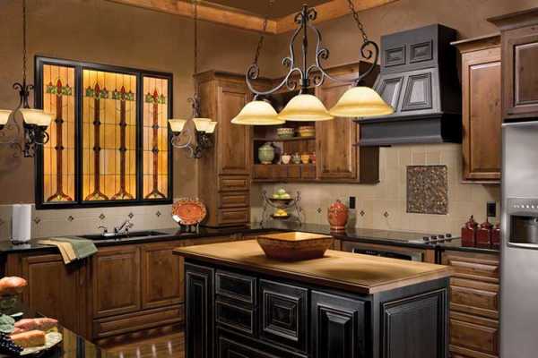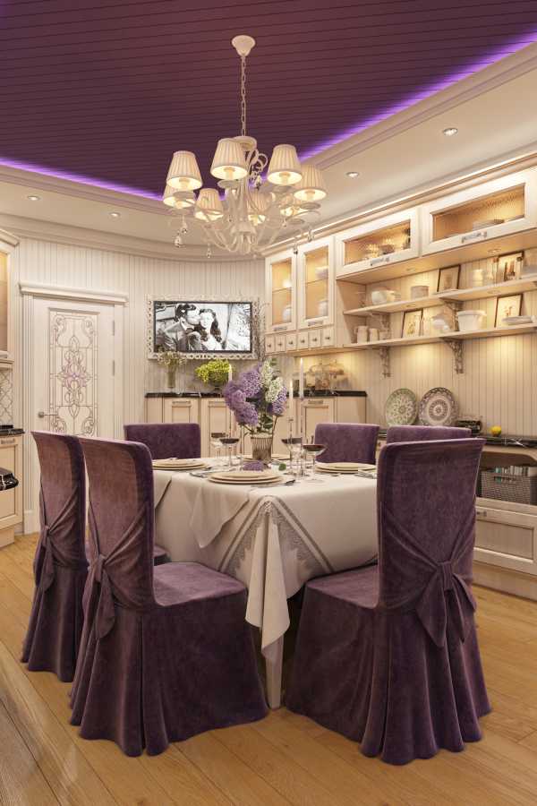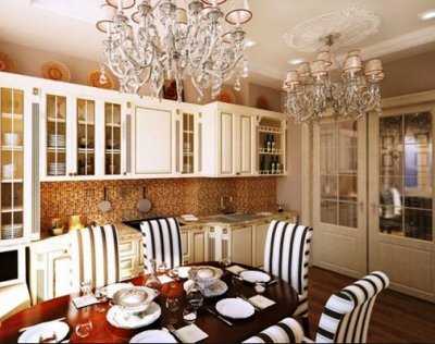 С особым вниманием стоит выбрать люстру — пластик, метал также под запретом. Для просторной кухни прекрасно подойдет изысканная стеклянная люстра с обилием орнамента и украшений. Для маленькой комнаты хорошим решением будет тканевый абажур.