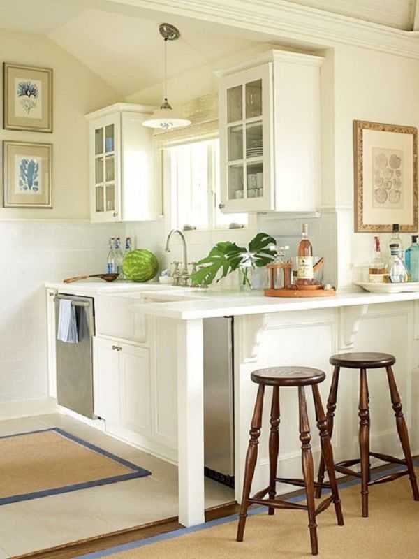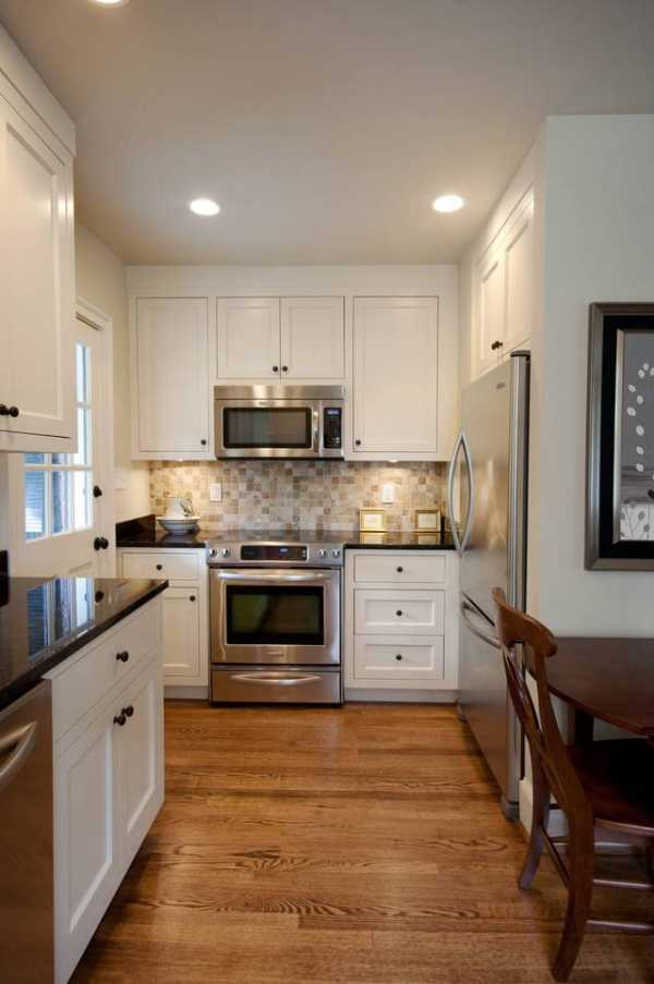 В маленькой кухне не стоит напирать на изысканные детали мебели, резьбу, завитушки и др. Чем проще будет выбранная мебель, тем просторнее будет казаться помещение.