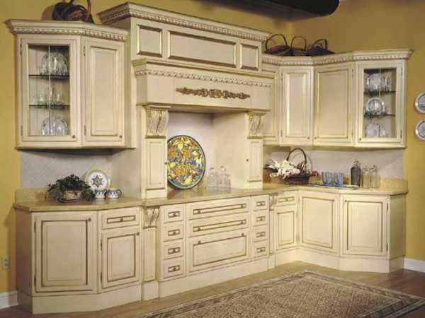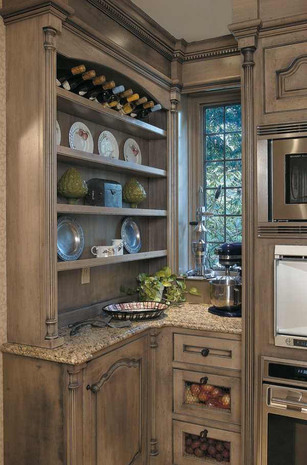 Если размер комнаты позволяет, то можно поставить на кухне большой комод со стеклянными дверями, украшенный резьбой.