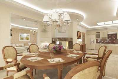 Совмещение кухни и столовой подходит для достаточно больших комнат. Важно не пытаться соединить на маленькой территории зону готовки и зону приема пищи. Сделать такую комнату комфортной очень тяжело, практически невозможно.