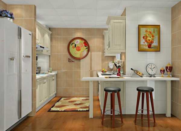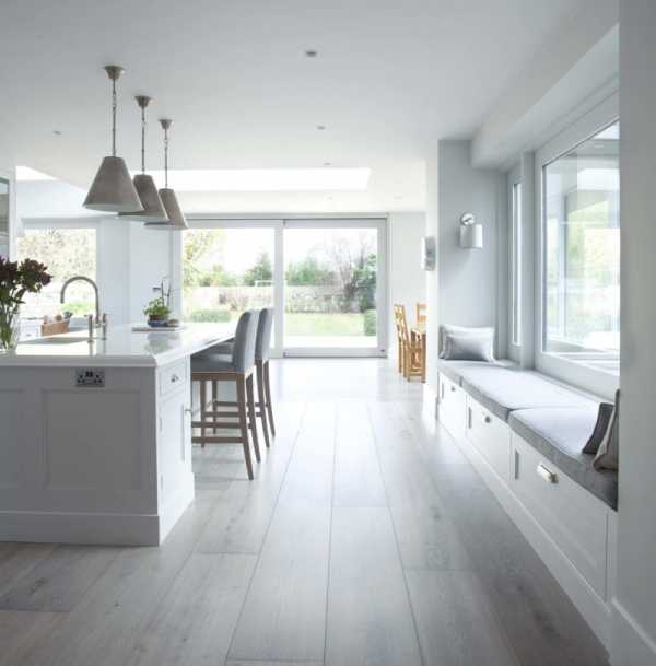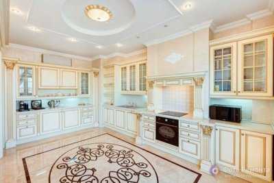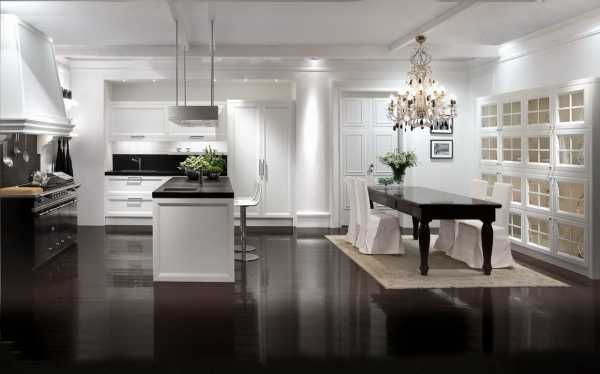 Прекрасным решением для пола будет водостойкий ламинат. Паркет можно заменить керамической плиткой, она будет смотреться изысканно. Чтобы кухня выглядела ещё более просторной, покрытие для пола тоже следует выбрать светлых тонов. Для классического направления больше всего подходит высокий потолок, при небольших размерах помещения это всегда удачно.