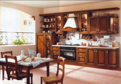 Оформление классической кухни предусматривает использование мебели из дерева. Пластмассовых деталей быть не должно. Уместной будет плетеная мебель либо кованые изделия из металла. Вся мебель должна быть натуральной и естественной. Искусственные материалы можно применять лишь в случае их схожести с натуральными. Современные фасады мебели из МДФ и пластика практически неотличимы от фасадов из натуральной древесины, к тому же и по цене такие гарнитуры в два раза дешевле.