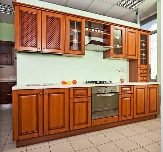 Столешница, как правило, делается на тон темнее, чем навесные и напольные шкафчики. В навесных шкафчиках рекомендуется использовать вставки из стекла.