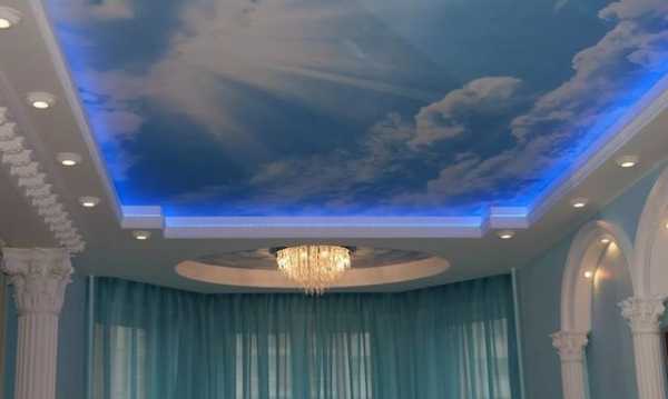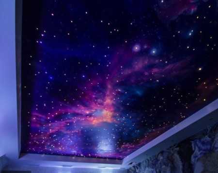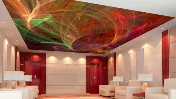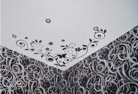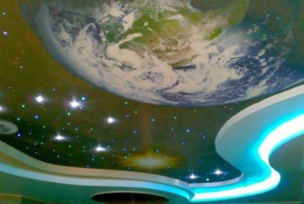 Натяжные потолки делают из поливинилхлоридного полотна или специальных тканей. Они переносят протечки сверху, удерживая большую массу воды. Но интересны еще и тем, что позволяют выполнить на поверхности разнообразные рисунки.