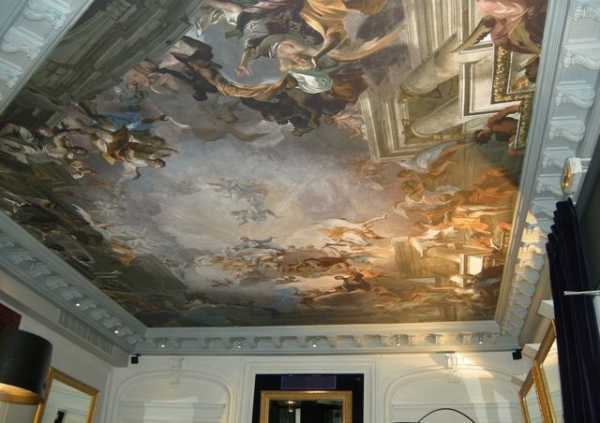 Фото – роспись по потолкуСделать роспись потолка не так уж сложно, если есть способности к рисованию. При наличии терпения и аккуратности интерьер приобретет изюминку.