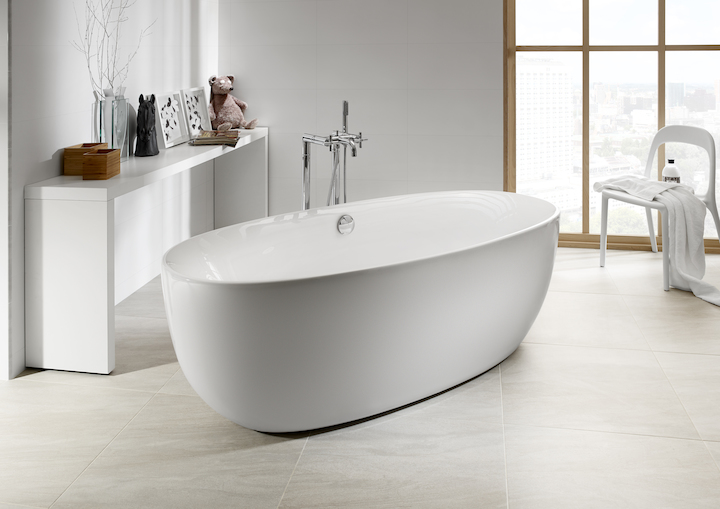 Create more space with a semi-wall and hide the toilet. The different levels in the bathroom and the sunken bath makes for a feeling of space and creates interest.