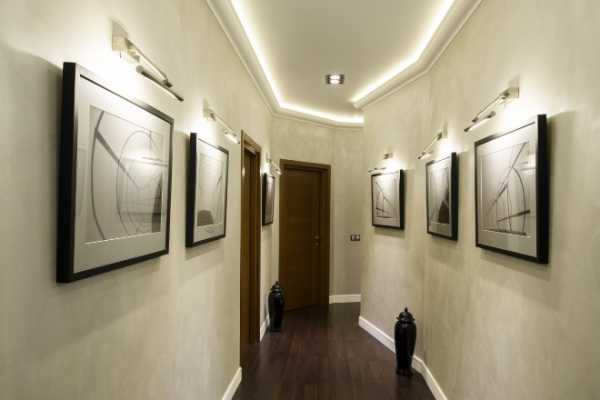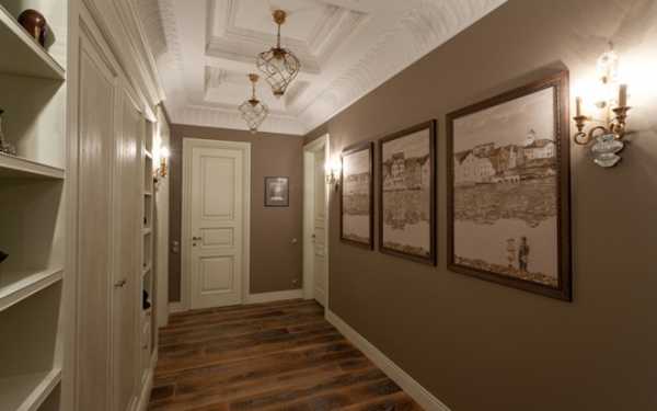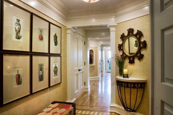 В коридоре вешают картины и фотографии в рамках одного стиля, лучше на стены с минимумом декора.