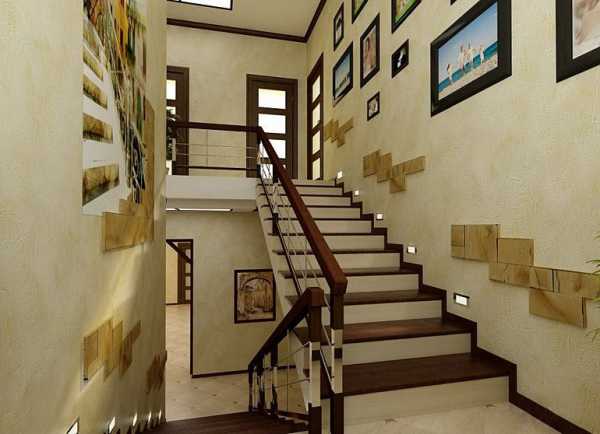 Повесить картину – не означает кардинально изменить облик прихожейПри размещении в один ряд, их выравнивают по центральной оси, верхнему или нижнему краю. В двухуровневой прихожей с лестницей картины развешивают по ходу ступенек, размещая на разных уровнях.
