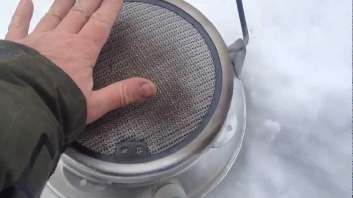 Вывод продуктов окисления производится через отверстия, предназначенные для поступления свежего воздуха, содержащего кислород. По конструкции бензиновый каталитический обогреватель представляет собой стальной сетчатый патрон с размещенным внутри сетчатым фитилем-катализатором, изготовленным из платины.