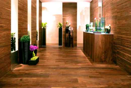 Ценные породы дерева в качестве облицовочного материала для комнат всегда были одним из отличительных признаков достатка в доме. Со временем керамическая плитка под дерево смогла заменить натуральную древесину, но благодаря своим «керамическим» свойствам ее можно без боязни использовать в самых критических точках дома.