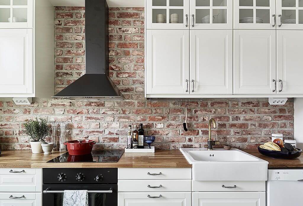 Фартук из красного кирпича с белыми шкафами создает красивый контраст.