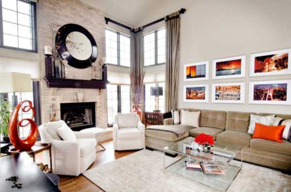 Пилястра в гостиной выделена декоративным бежево-коричневым кирпичом