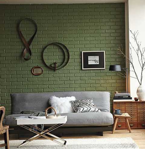 Крашеная в зеленый цвет кирпичная кладка в гостиной